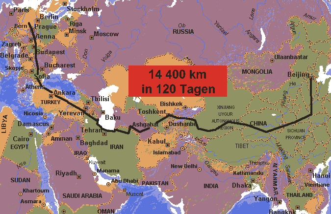 Here you can see they way we decided to take: instead of going direct trough Russia we took 10 foreign countries and saw the islamic states