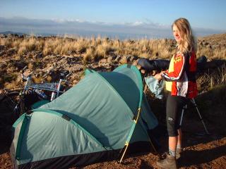 Home sweet home: Our tent provides more warmth after we stored all 5 bikepacks and Valerias backpack in it...